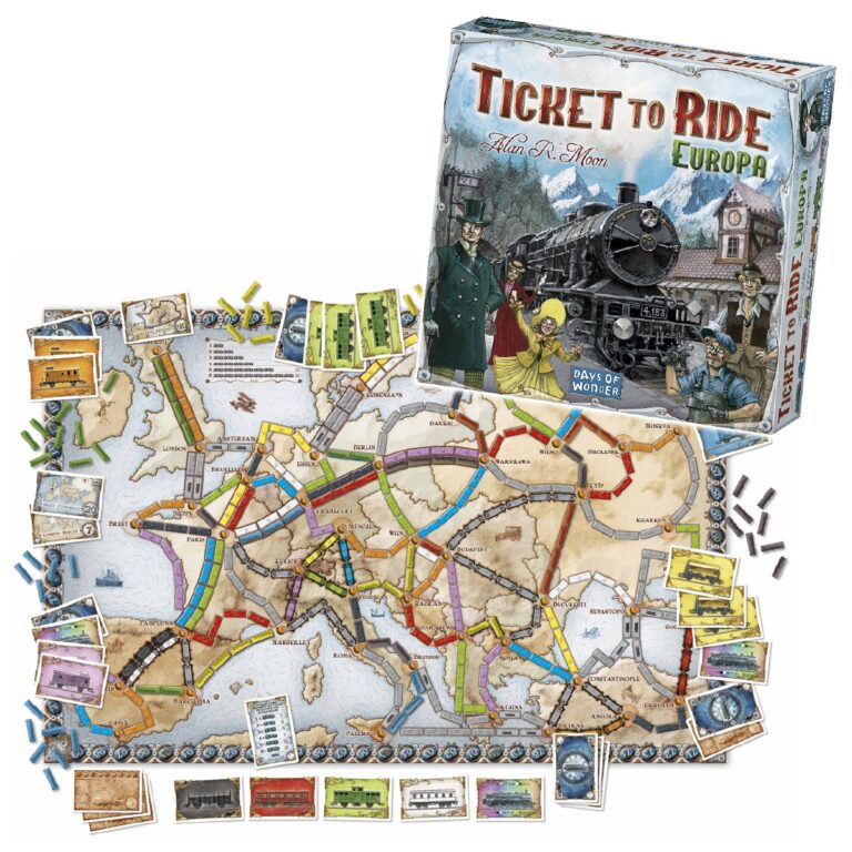 Ticket to Ride Europa - gioco da tavolo. Dalle colline scoscese di Edimburgo ai moli soleggiati di Costantinopoli, dai vicoli polverosi di Pamplona a una ventosa stazione di Berlino, Ticket to Ride Europa ti guida in una nuova Avventura e natura attraverso le grandi città europee di inizio secolo. Sfiderai le buie gallerie della Svizzera? Ti avventurerai su un traghetto del Mar Nero? O costruirai sfarzose stazioni nelle grandi capitali dei vecchi imperi? La tua prossima mossa potrebbe fare di te il più grande magnate ferroviario d’Europa! Prepara i bagagli, chiama il facchino e sali a bordo! Ticket to Ride Europa aggiunge un nuovo capitolo alla nostra serie di avventure ferroviarie di grande successo. I giocatori accumulano carte di vari tipi di vagoni e le utilizzano per costruire stazioni, attraversare gallerie e viaggiare sui traghetti al fine di controllare le linee ferroviarie di tutta Europa. Ticket to Ride Europa è un gioco semplice ed elegante: sono sufficienti 5 minuti per imparare a giocare, ed è apprezzato sia dalle famiglie che dai giocatori più esperti. Numero di giocatori: 2 − 5 Durata media: 30 - 60 min. Età suggerita: 8+