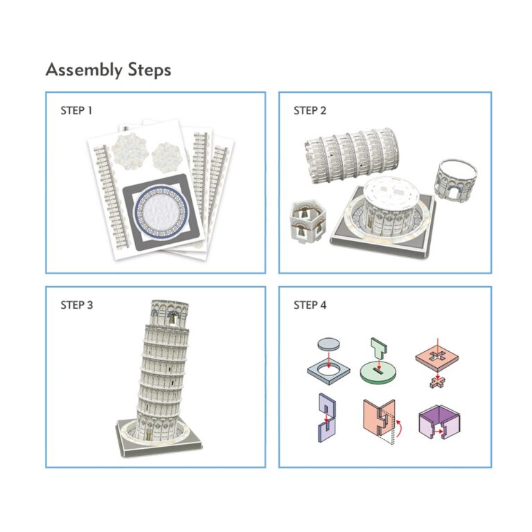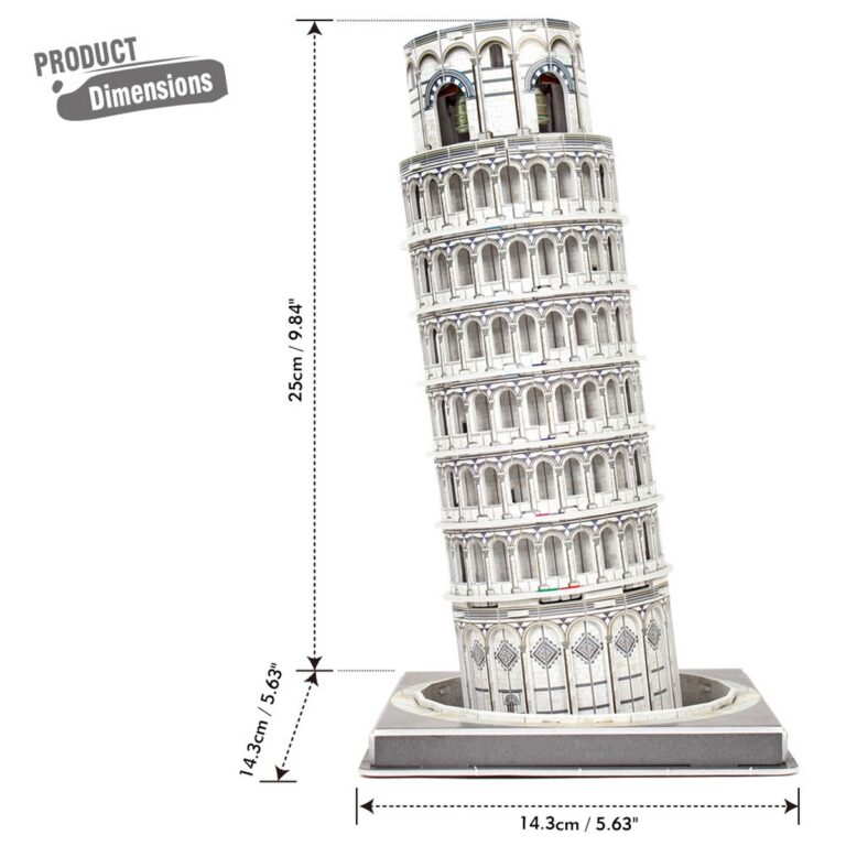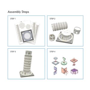 Puzzle 3D divertente e stimolante per replicare la famosa torre pendente di Pisa. Facilissimo da assemblare, senza bisogno di forbici, colla o nastro adesivo. Numero di pezzi : 27 – Dimensioni : 14,3 x14,3 x 4,7 cm