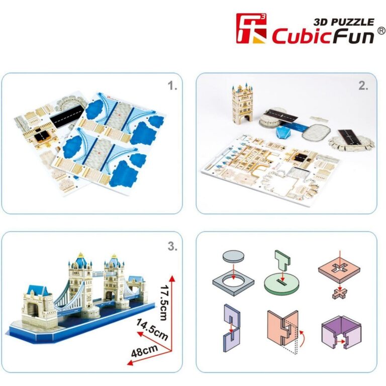 Puzzle 3D divertente e stimolante per replicare il famoso Tower Bridge di Londra. Facilissimo da assemblare, senza bisogno di forbici, colla o nastro adesivo. Numero di pezzi: 52 Difficoltà 4 su 10. Dimensione modello finito 48 x 14,5 x 17,5 cm