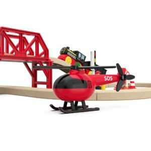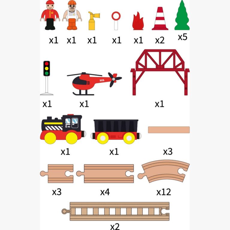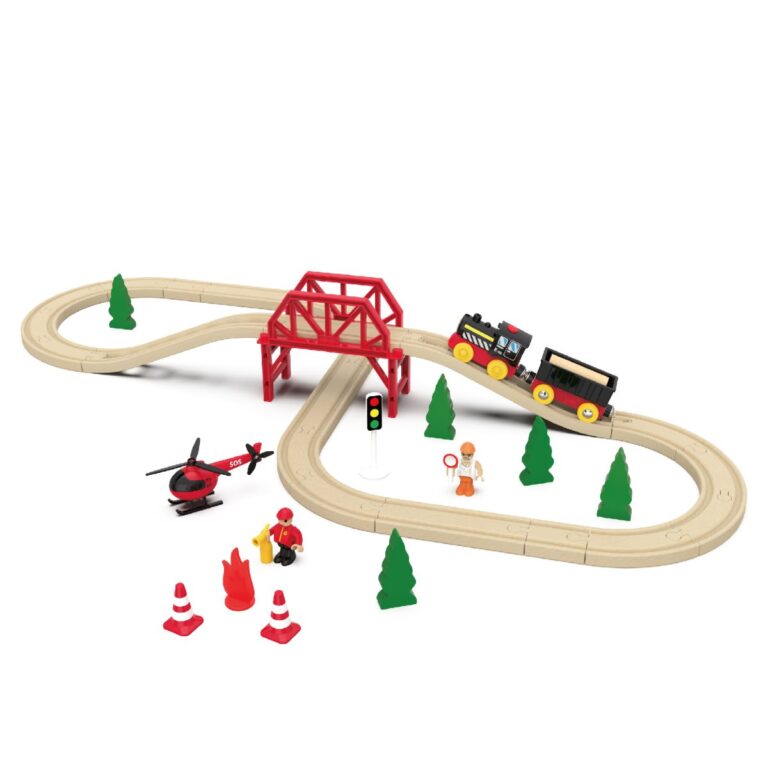 Il trenino motorizzato a batteria attraversa il circuito trasportando il legname, mentre l’elicottero sorvola la zona per coordinare i pompieri a terra. Grazie agli attacchi magnetici, i vagoni e gli accessori si collegano in un attimo, permettendo ai piccoli di cambiare scenario ogni volta che vogliono.