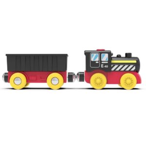 Il Treno Elettrico Henry di Mykafort offre un’esperienza di gioco immersiva per i piccoli appassionati di trenini. Il set include la locomotiva e una carrozza posteriore per trasporto merci, tutte realizzate in ABS resistente. Tutti i veicoli possono muoversi sulle rotaie e sono compatibili con la maggior parte delle altre marche di trenini in legno, permettendo di integrare facilmente il set con altri giochi.