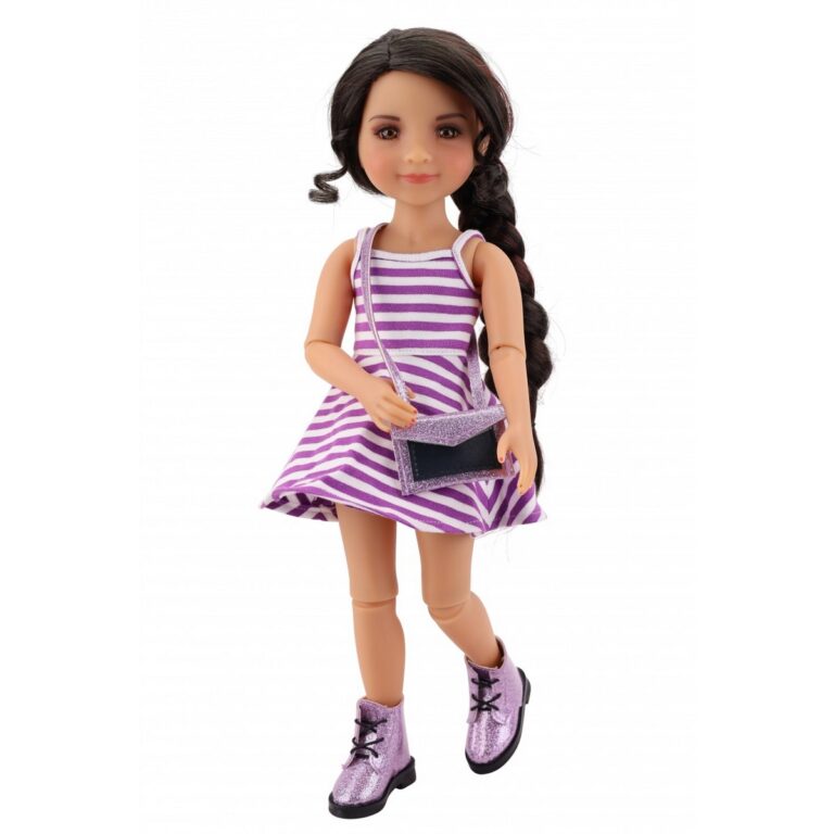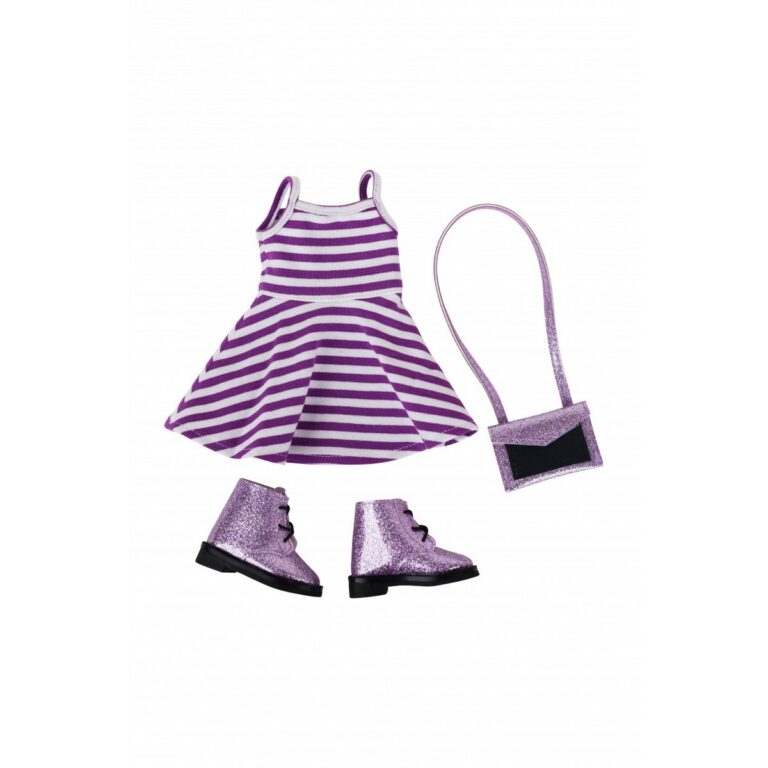 Outfit per bambole Ruby Red Fashion Friends (37 cm). La tua bambola sarà davvero molto elegante con questo favoloso outfit composto da un prendisole a righe orizzontali bianche e viola, una borsa glitter viola e un paio di accattivanti stivali glitter viola. Bambola non Inclusa