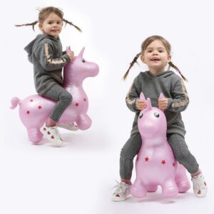 Unicorno cavalcabile - Adatto ai più piccoli a partire dai 10 mesi, il grazioso unicorno paffuto viene utilizzato come palla da salto con due "maniglie per le orecchie". La sua struttura in plastica spessa garantisce una buona stabilità e una forte solidità per giocare in casa o in giardino. Pensato per lo sviluppo delle capacità motorie dei bambini, è ideale per bambini di diverse età. Può aiutare il bambino a stare in piedi, muoversi e stimolare la sua destrezza. Per i bambini più grandi il salto offre un buon allenamento fisico, favorisce il controllo dell'equilibrio e lo sviluppo della coordinazione motoria. Dimensioni dell'unicorno: 24 x 53 x 61 cm. - Età: +10M
