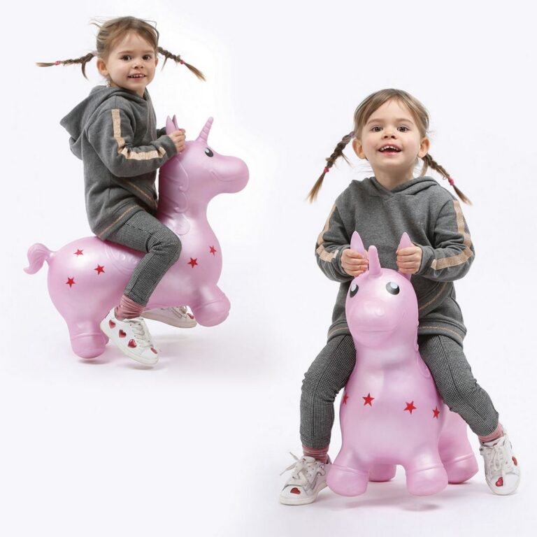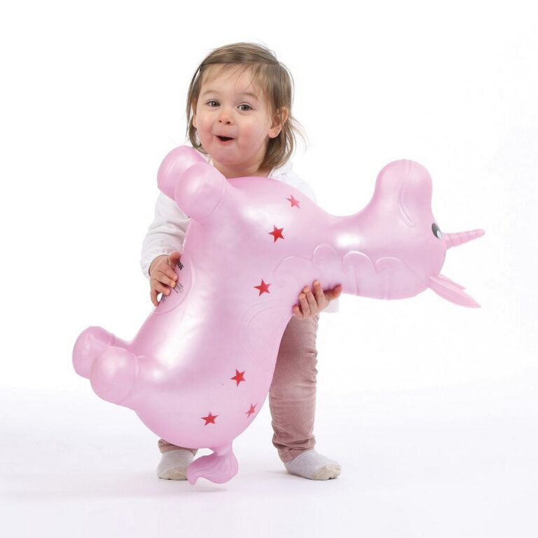 Unicorno cavalcabile – Adatto ai più piccoli a partire dai 10 mesi, il grazioso unicorno paffuto viene utilizzato come palla da salto con due “maniglie per le orecchie”