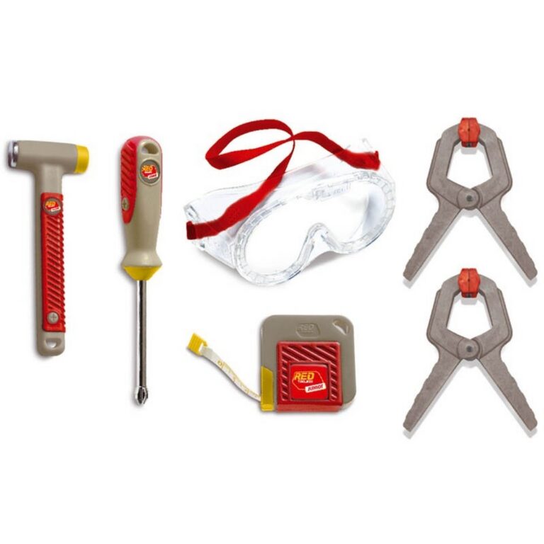 Kit di utensili e strumenti da lavoro a misura di bambino per realizzare manufatti in legno. Comprende: visiera, cacciavite, martello, metro, morsetti