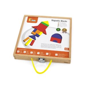 Questa valigetta contiene 42 tessere magnetiche di diverse forme e colori e 12 carte con 24 modelli. Entrambe le lavagne bianche all'interno della scatola di legno sono magnetiche.