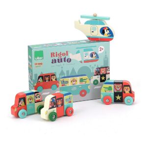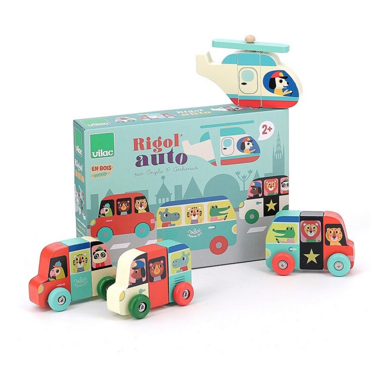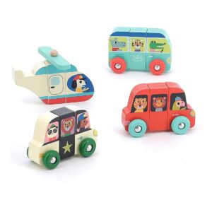 Questo gioco è composto da 4 veicoli magnetici in legno (un pullman, una macchina, un elicottero e un'auto da polizia) da assemblare o da mescolare per creare i propri modelli.