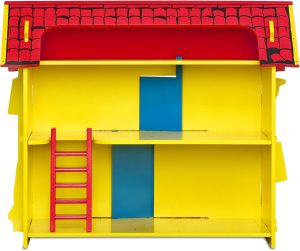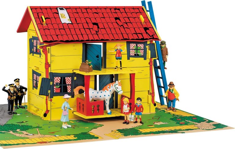 Questo set include una casa giocattolo in legno, facile da costruire e smontare. La casa comprende una scala interna, una scaletta e un tappetino in cartone per rappresentare il giardino di Pippi, un foglio di adesivi con tende, quadri e stufa.