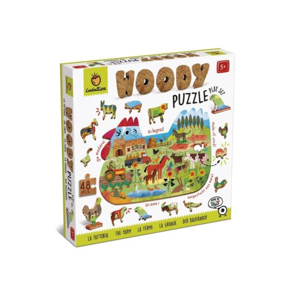 Woody puzzle – La fattoria. Un puzzle di legno dalla forma speciale con illustrato un colorato paesaggio. Tra i pezzi che compongono il puzzle ci sono 12 animali sagomati da posizionare anche in piedi sulle apposite basette. Il gioco stimola la logica, le abilità visuo-spaziali e la manualità fine. Puzzle sagomato di legno da 48 pz circa 25×35 cm - 12 basette per animali. Età: 5+