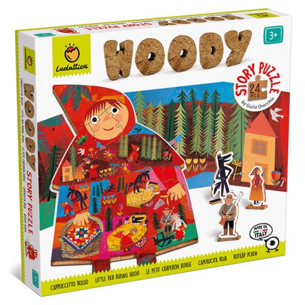 Le avventure di Cappuccetto Rosso prendono forma ricomponendo, pezzo dopo pezzo, il puzzle di legno sagomato e giocando con i personaggi di legno sullo scenario illustrato.
