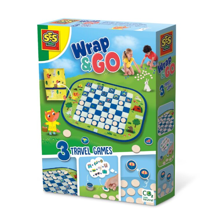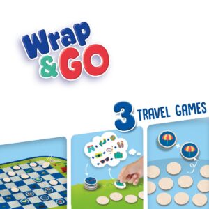 Wrap&Go giochi da viaggio - Dama-Memo-Viaggio. Il set di gioco perfetto per le giornate fuori casa, le vacanze o anche a casa. Wrap&Go è una serie divertente in cui è sufficiente aprire il tabellone in tessuto per giocare. Contiene diversi pezzi per 3 giochi. Finito di giocare? Basta ripiegare il tabellone con tutti i pezzi e le parti. È semplice e compatto, così puoi portarlo con te ovunque. Questo Wrap&Go include i giochi Dama, Memo e Viaggio. Viene fornito con 32 pedine in legno stampate e le istruzioni. Età: 4+